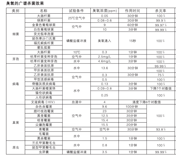 臭氧具有極強的氧化性的特點,被世界公認是一種廣譜高效殺菌劑,它的氧化能力高于氯一倍,滅菌比氯快600-3000倍,甚至幾秒鐘內(nèi)可以殺死細菌,對于常見的大腸桿菌、糞鏈球菌、綠膿桿菌、金黃葡萄球菌、霉菌等,在臭氧的環(huán)境中5分鐘,其殺滅率可達到99%以上。
